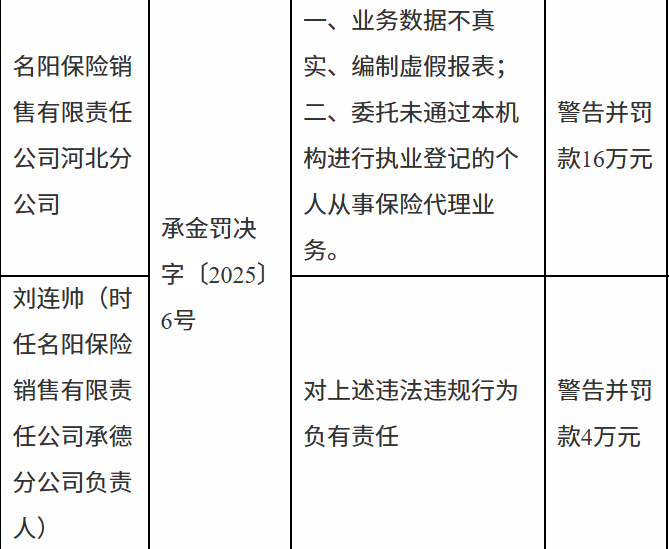 12月1日,国家金融监督管理总局承德监管分局行政处罚信息公开表显示,名阳保险销售有限责任公司河北分公司因务数据不真实、编制虚假报表;委托未通过本机构进行执业登记的个人从事保险代理业务被警告并罚款16万元。刘某帅被警告并罚款4万元。