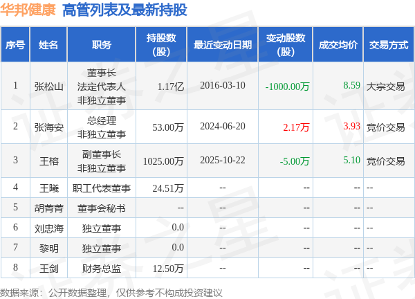 华邦健康的高管列表及最新持股情况如下:
